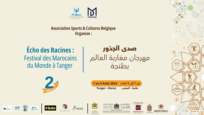 Avec le soutien du Ministère de la Culture, de la Jeunesse et de la Communication, du Ministère des Affaires étrangères, de la Coopération africaine et des Marocains résidants à l’étranger, et en partenariat avec le Conseil de la ville de Tanger ,et de la Commune de Saint Josse à Bruxelles, l’association « sport et culture » Belgique organise la 2ème édition du Festival « Écho des Racines » Festival des Marocains du monde.